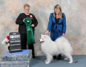 Kelsa was ranked as the #1 Samoyed in Canada for the year, until the end of June 2013, and finished the year as the #1 Bitch, #3 overall – not bad at almost 10 years old! Her last show of